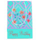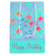 Saco de presente com padrão bonito de tamanho médio com design floral, o texto de aniversário feliz pode ser alterado para se adequar a qualquer pessoa ou ocasião, e todos os elementos são removíveis. O fundo e a faixa lacrimogênea podem ser alternados para qualquer cor.