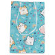 Saco de presente de aniversário feliz com um padrão de gato giro, colocado sobre um fundo azul e decorado com arco-íris e estampas de pata e muito mais.