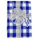 Arco branco com etiqueta de presente no padrão de xadrez de búfalo branco e azul. O texto de aniversário feliz está na etiqueta de presente.