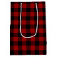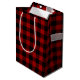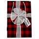 Arco branco com etiqueta de presente no padrão de xadrez de búfalo vermelho e branco. O texto de aniversário feliz está na etiqueta de presente.