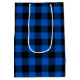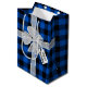 Arco branco com etiqueta de presente no padrão de xadrez de búfalos preto e azul e texto de aniversário feliz.