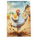Feliz frango dançando na sujeira com sol brilhante da manhã e celeiro de fazenda para o aniversário. O texto pode ser alterado ou excluído.