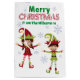 Este saco de presentes de Natal fotórico e engraçado apresenta um tema de Natal festivo. Uma imagem de dois elfos - um irmão e uma irmã - é ilustrada dançando na parte inferior. Você pode substituir os rostos dos elfos pelas fotos personalizadas do seu filho. Uma saudação de Feliz Natal é impressa no topo com a palavra "Feliz" impressa em um design de folha verde, e a palavra "Natal" impressa em um padrão de balão de folha listrada de cana-doce. Um nome de família de exemplo é impresso abaixo em uma fonte verde branca. Flocos de neve com estilo brilhante azul acentuam o fundo.