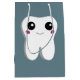 Um saco de presentes com um desenho de um dente branco grande com um sorriso kawaii fofo e grandes olhos felizes.