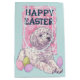 Uma cena viva de Páscoa com um cachorro adorável em meio a uma coleção de ovos vibrantes da Páscoa. O canino brincalhão adiciona charme à atmosfera festiva, cercada por uma série de ovos coloridos enfeitados com designs brancos.