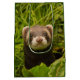 Saco de presente de aniversário feliz com uma fotografia adorável com um pequeno furão marrom em pé em um capim longo. Que bom!