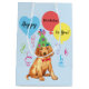 Feliz aniversário com este design bonitinho com um fofo e festeiro cachorro irlandês que veste chapéu de festa cercado por balões e galerias coloridos. Feliz Aniversário, [nome]" na frente e "Feliz Aniversário para Você!" nas costas. O nome pode ser facilmente alterado; basta clicar no botão personalizar.