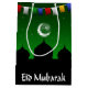 Ilustração do cumprimento de Eid Mubarak com uma festão festiva e colorida em uma cena mágica da noite com uma silhueta da mesquita e a lua e as estrelas em um céu nocturno verde.