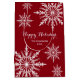 Preencha os flocos de neve brancos personalizados de inverno em Feriados vermelhos felizes com o Saco médio de presente de Natal ou feriado. Personalize-o com seu nome de família e ano. Estes sacos de presente de inverno elegantes e personalizados contêm flocos de neve brancos complexos com um fundo vermelho rico.