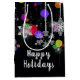 Flocos de neve prateados de férias em preto com luzes de anéis coloridas e rochas. O texto pode ser editado ou excluído.