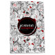 Monogramas na frente e no verso padrão retrofloral preto e branco com acentos vermelhos