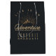 Saco de presente de graduação com ilustração dourada sobre fundo de cinza preta. Projetado com uma ilustração de uma montanha com raios solares brilhando por trás. A tipografia diz: "A vida é uma descoberta de sonho de uma Aventura".