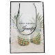 Um saco de presentes com uma fotografia com um par de abacaxi sentado numa praia arenosa.