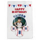Bandeja de Bola de Baseball Bandeiras de Aniversário de criança Foto Média de Presente. O design tem bandeiras de baseball e bunting em cores vermelha, branca e azul. No centro está uma foto personalizada. Adicione seu nome, foto e idade.