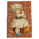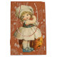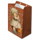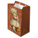 Saco de presente de Halloween com uma garotinha de vestido antiquado, entalando uma maçã e jogando a pétala sobre o ombro. Este foi um jogo jogado por crianças. A pétala de maçã cairia indicando as iniciais ou o nome do seu futuro.