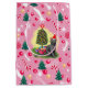 Design de Natal lindo, lúcido e alegre, com uma ilustração de um gato preto com árvore de Natal e um padrão flutuando ao redor.