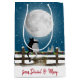 Gatos em uma cerca de madeira com sinal de Feliz Feriado e lua de cheio em flocos de neve. O texto é editável.