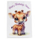Uma girafa de bebê bonitinha ao estilo de desenho animado com olhos grandes e expressivos e um sorriso alegre. Fica numa pose brincalhona, o humor geral é alegre e caprichoso, perfeito para presentes infantis.