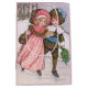 Lovely vintage illustration of a cute girl and a boy skating on ice while snow is falling, wearing feathered hats and carrying holly branches for Christmas. By English artist Florence Hardy.