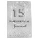 Elegante, clássico, glamouroso e feminino para uma Quinceañera, 15 festa de aniversário. Um fundo metálico prateado. Decorado com pó de brilho. Personalize e adicione um nome. Com o texto: Parabéns. O nome é escrito com um moderno estilo escrito à mão. O número 15 é escrito com uma fonte no estilo do balão.