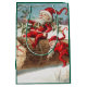 Funny vintage Christmas illustration of little white bearded gnomes dressed like Santa, dragging a cut tree trunk through the snow. Published by L. Prang & Co.