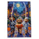 Adoráveis Goldendoodles vestidos com fantasias lúcidas de Halloween carregar baldes de abóbora enquanto trick-or-tratando sob o céu iluminado. Este design festivo põe em evidência os caramujos lisos da raça, a face alegre e a personalidade lúdica, capturando perfeitamente a atmosfera assustadora e divertida da noite de Halloween. Uma celebração animadora para amantes de cães e fãs de Halloween.