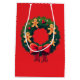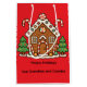 Cute, fun festive holiday bag with colorful gingerbread houses, designed with candy canes and Christmas trees on a red background. Great for wrapping Christmas gifts for all your friends and family with a personalized message.