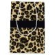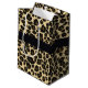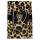 Saco de presente brilhante médio com uma imagem de uma linda impressão-leopardo e fita preta opcional, arco preto e cabeça-leopardo dourada. Ver a correspondência entre um grande saco de presentes, confetti, caixa de favor, etiqueta de favor e papel de embalagem. Veja toda a coleção Safari Gift Bag nos TOUCHES ESPECIAIS| Seção Favoritos para festas.