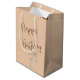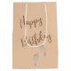 Mulher jovem caminhando em uma praia oceânica com surf. Feliz texto de aniversário e pegadas na areia do lado oposto. O texto é editável.