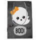 Saco de presente do Dia das Bruxas bonito com um fantasma sorridente com bochechas rosadas, um arco laranja e texto "Boo!" sobre um fundo escuro. Perfeito para favores de Dia das Bruxas das Crianças, guloseimas de sala de aula, ou entrega de doces na noite do truque ou do tratamento. Um design de Dia das Bruxas divertido e amigo da família.