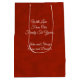 Um saco de presentes de Natal super fofo e médio tem um papel vermelho texturizado e dois quadros para algumas das suas fotos favoritas da família. Flocos de neve brancos bonitos estão espalhados. O fundo diz: "Tenha um Natal Feliz, que pode ser mudado para qualquer coisa que você queira personalizá-lo para sua família. O verso da bolsa diz "Com amor da nossa família até a sua" (que também pode ser mudado) e um lugar para os seus nomes. Estão disponíveis outros tamanhos.