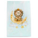 Saco de presente de aniversário feliz com uma ilustração de aquarela fofa. Um adorável leão vestindo uma coroa pescando estrelas sentadas em uma lua crescente descansando em uma nuvem fofinha. Um monte de estrelas de folha de ouro falsas nas nuvens dá a esta design uma sensação mágica. Fundo de aquarela azul claro.