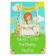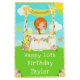 Essa bolsa de presente de aniversário fofa e caprichosa pode ser personalizada com um nome ou título como filha, neta, sobrinha, amiga etc. Ele apresenta uma cabeleira vermelha com pele justa em um suporte de limonada amarela que é decorado com flores e bunting. Ao fundo está um céu azul, sol e borboletas. Isto é perfeito para uma festa de aniversário de verão. Gráficos de MUJKA