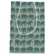 Um Saco Médio de Presente divertido com filas de silhuetas elefantes, cheias de um padrão azul escuro e de Paisley Burgundy, em um fundo verde-sábio. Parte da coleção Posh & Painterly 'Heffalumps', este padrão pode ser ajustado para ajustado qualquer Gift Bag ou Gift Box.