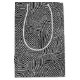 Um desenho abstrato de linhas e pontos pretos é colocado sobre um padrão legal impresso em folha prateada nesses sacos de presentes médios. Divertido para aniversário, chá de panela, casamento, doação de presente de feriado ou qualquer ocasião. Mais cores em nossa loja.