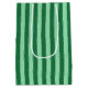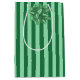 Saco de presente brilhante médio com uma imagem de listras verdes claras e escuras e um arco verde opcional na frente. Ver o grande saco de presentes, confetti, caixa de favor, etiqueta de favor, etiqueta e papel de embalagem. Veja a Rua inteira. A coleção do Patrick Day Gift Bag nos TOUCHES ESPECIAIS| Seção Favoritos para festas.