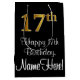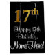 Este luxuoso, na moda, e elegante design de presente de aniversário apresenta um grande número ordinal "17º", com um olhar falho/imitação inspirado em ouro, juntamente com a mensagem de saudação de aniversário "Feliz 17º aniversário", e um nome de destinatário personalizável em uma fonte estilo script. Também tem um fundo de cor preta. Um presente temático de aniversário como este pode ser uma maneira divertida de embrulhar um presente ou presente para alguém que comemora seu 17º aniversário. [~Z0000514]