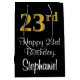 Este na moda, sofisticado e luxuoso design de saco-presente com temas de aniversário apresenta um grande número ordinal "23. º", com um aspecto de imitação/falsa aparência de ouro, além da mensagem de saudação de aniversário "Feliz 23. º Aniversário" e um nome de destinatário personalizado em uma fonte estilo script. O fundo é preto colorido. Um presente temático de aniversário como este pode ser uma maneira divertida de embrulhar um presente ou presente para celebrar o vigésimo terceiro aniversário de alguém. [~Z0000514]