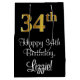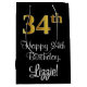 Este sofisticado, elegante e luxuoso design de bolsa de presente de aniversário tem um grande número ordinal "34" com um padrão de gradiente tipo ouro imitação/falsa, juntamente com a mensagem de saudação de aniversário "Feliz 34.º Aniversário" e um nome de destinatário personalizável em uma fonte estilo script. O fundo é preto colorido. Um presente temático de na moda de aniversário como este pode ser uma maneira divertida de embrulhar um presente ou apresentar a alguém que comemora seu trinta e quatro anos de aniversário. [~Z0000514]