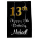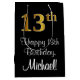 Este na moda, elegante e luxuoso design de sacola de presente com temas de aniversário apresenta um grande número ordinal "13" com uma aparência de imitação/falsa inspirada em ouro, além da mensagem de saudação de aniversário "Happy 13 Birthday", e um nome de destinatário personalizável em uma fonte estilo script. Também tem um fundo de cor preta. Um presente temático de aniversário como este pode ser usado para dar um presente ou presente em comemoração do 13 de alguém. [~Z0000514]