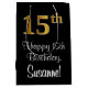 Este elegante, luxuoso e na moda, design de saco-presente temático de aniversário apresenta um grande número ordinal "15" com um padrão de gradiente falsa/imitado inspirado em ouro, juntamente com a mensagem de saudação de aniversário "Feliz aniversário do 15", e um nome de destinatário personalizado em uma fonte estilo script. O fundo é preto colorido. Um saco-presente como este pode ser usado ao embrulhar presentes que são dados a alguém em comemoração do seu décimo quinto aniversário. [~Z0000514]