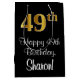 Este design de bolsa de presente de aniversário sofisticado, elegante e luxuoso apresenta um grande número ordinal "49º", com um visual de ouro imitação/falsa, juntamente com a mensagem de saudação de aniversário "Happy 49º aniversário" e um nome de destinatário personalizado em uma fonte estilo script. O fundo é preto colorido. Uma bolsa de presente elegante como esta pode ser usada quando embrulhar presentes é dado a alguém em comemoração do seu quarenta nono aniversário. [~Z0000514]
