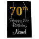 Este elegante, na moda, e sofisticado design de bolsa de presente temático de aniversário apresenta um grande número ordinal "70" com aparência de ouro falso/imitação, além da mensagem de saudação de aniversário "Feliz aniversário do 70" e um nome de destinatário personalizável em uma fonte estilo script. Também tem um fundo de cor preta. Um saco de presentes temático de aniversário como este pode ser uma maneira divertida de embrulhar um presente ou presente para celebrar o setuagésimo aniversário de alguém. [~Z0000514]