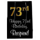 Este na moda, sofisticado e elegante design de gingalô com tema de aniversário apresenta um grande número ordinal "73. º" com um padrão de gradação de imitação/falsa inspirado em ouro, juntamente com a mensagem de saudação de aniversário "Happy 73. º aniversário" e um nome de destinatário personalizado em uma fonte estilo script. O fundo é preto colorido. Um saco-presente elegante como este pode ser usado ao embrulhar presentes sendo dado a alguém em comemoração de seus setenta e três anos. [~Z0000514]