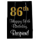 Este sofisticado, na moda, e luxuoso design de bolsa de presente temático de aniversário apresenta um grande número ordinal "86" com um padrão de gradiente tipo ouro falso/imitação, juntamente com a mensagem de saudação de aniversário "Feliz 86.º Aniversário" e um nome de destinatário personalizado em uma fonte estilo script. Também tem um fundo de cor preta. Um saco de presente temático de aniversário como este pode ser usado para dar um presente ou presente em comemoração do oitenta e sexto aniversário de alguém. [~Z0000514]
