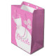 Bonito bolsa de presente temático de noiva em tons de rosa apresentando um vestido de noiva estilizado e flores em fundo rosa. Um design personalizável para você personalizar com seu próprio texto, imagens e ideias.