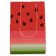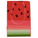 Gift Bag de médio porte com imagem de design de trabalho de arte de de de Melancia de Ripe Deliciosa de Suco pelo FabricSeal no Zazzle. Adorável em aproveitar e comer fruta de verão rosa e vermelha populares com casca verde. Esta é uma ilustração gráfica digital com várias seções de linhas horizontais com tons de paleta colorida de verde escuro, verde médio, verde claro, verde-claro, vermelho-escuro-rosado-escuro, rosa-escuro, rosa-médio, rosas claro, rosa-pálido e preto-escuro para as sementes. Este design de arte é perfeito para o ano todo e especialmente nas estações de primavera e verão. Excelente escolha de moda e acessórios, acessórios de decoração, decoração de parede, recipientes de bebendo de bebidas, acessórios de dispositivos eletrônicos, decoração de cozinha, comida, fruta, arte de fruta de legumes e melancias e produtos coletores e muito mais.