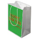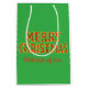 Unique colorful green holiday gift bag with "Merry Christmas" in bold gold letters filled with a red and green design to greet the receiver, delight your family and friends with a special message, "with lots of love" in red which can be changed and personalized for the recipient and Happy New Year on the other side.