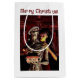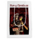 Merry Christmas text you can customize. Funny skeleton wearing a Santa hat and holding a gift. Pretty woman holding the skeleton.