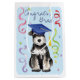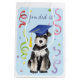 Felicite seu formando favorito com um presente em um saco que caracteriza um formando pequeno bonito do Schnauzer diminuto que veste um mortarboard entre uma agitação dos confetes.